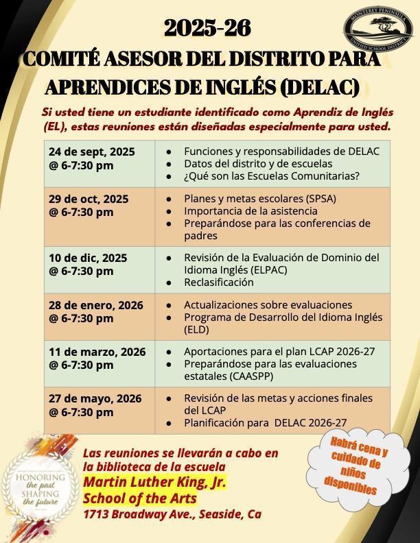 In addition, DELAC (District English Learners Advisory Committee) meets several times a year. Representatives from each school's ELAC committee and administration meet to discuss the services the district provides.